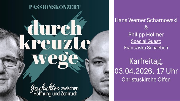 Hans Werner Scharnowski und Philipp Holmer laden ein auf eine tiefgründige, musikalische Reise in die Passionszeit. Unterstützt werden sie dabei von Special Guest Franziska Schaeben.