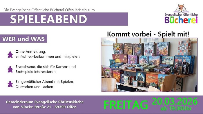 Es geht in die nächste Runde. Am 20.03.2026 treffen wir uns um 19:30 Uhr im Gemeinderaum der ev. Christuskirche zum gemeinsamen Spielen, Grübeln, Lachen und Quatschen. Ob Karten- oder Brettspiele, Spaß und Gemeinschaft stehen hier im Mittelpunkt.