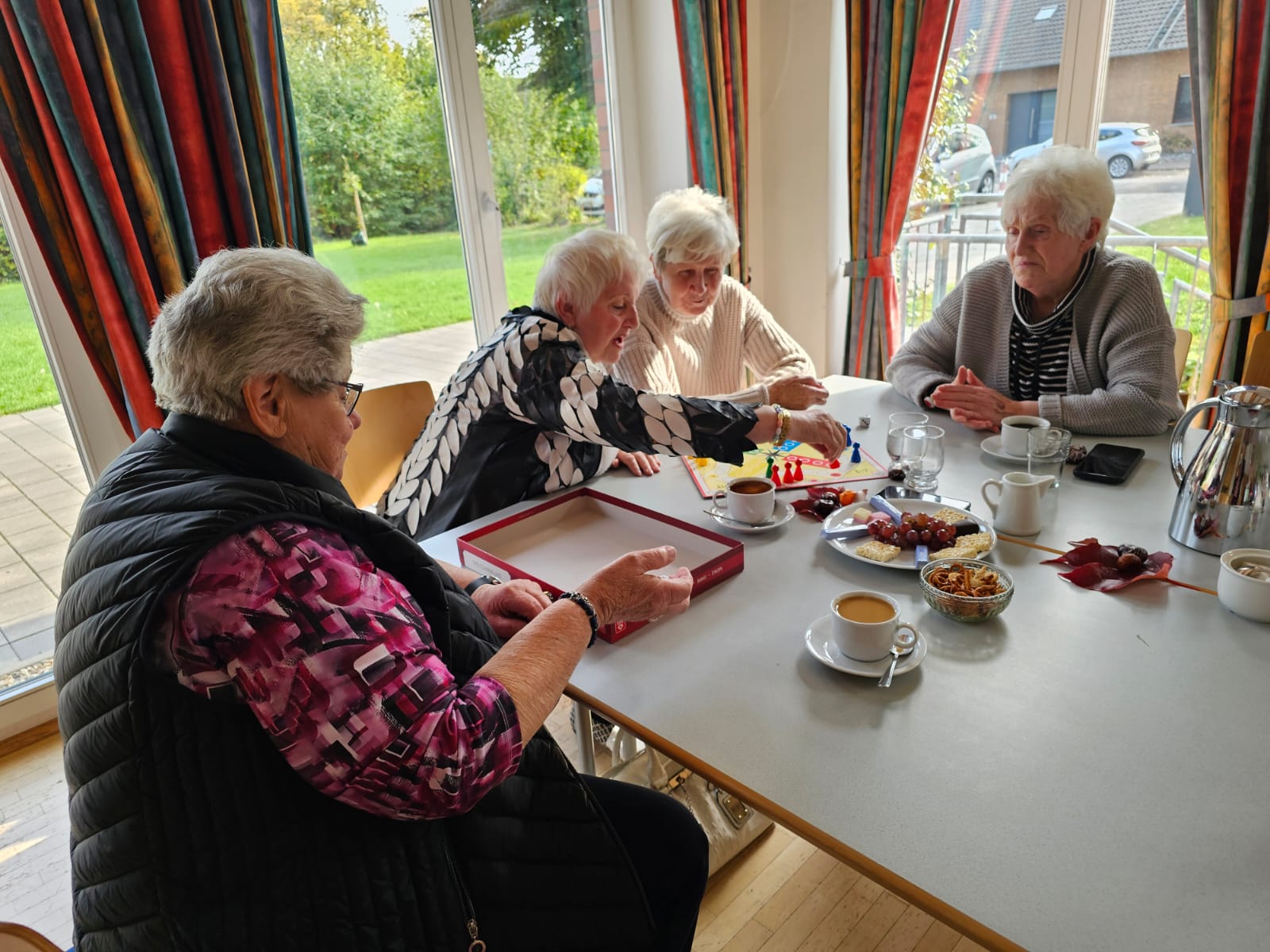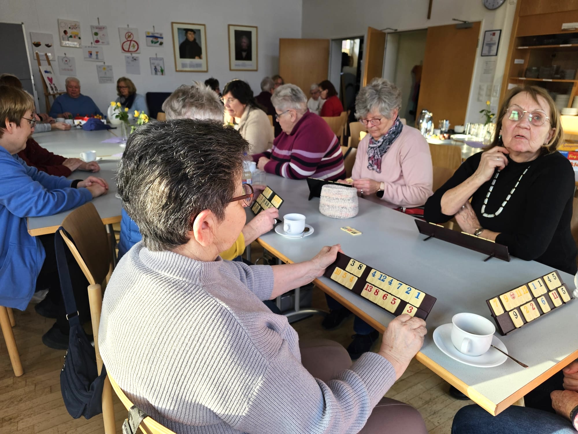 Im Gemeinderaum kann aus einer Auswahl von Gesellschaftsspielen wie Rummikab, Mensch-ärgere-dich-nicht, Kniffel u.a. ausgewählt werden. Es können auch eigene Spiele mitgebracht werden, Mitspieler*innen finden sich immer. Aber auch der Austausch kommt nicht zu kurz, bei Kaffee und Keksen kommt man schnell ins Gespräch.