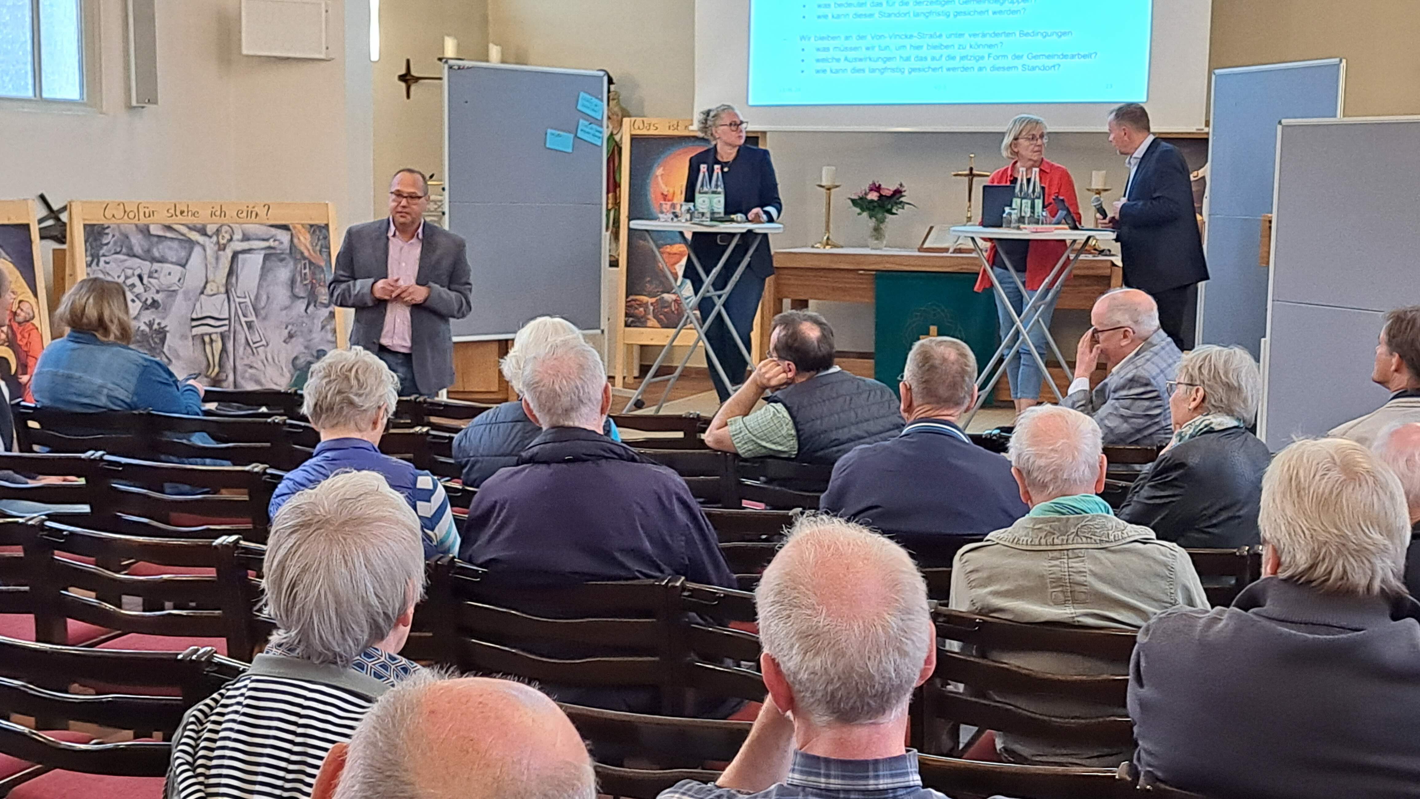 Dies war das Thema der Gemeindeversammlung, zu der die Christuskirchengemeinde alle Gemeindemitglieder und Interessierten am Donnerstag, 13.06.2024 eingeladen hatte. Gemeinsam mit dem Superintendenten Holger Erdmann informierte das Presbyterium der Gemeinde über die aktuelle Situation (vgl. Fotos von Peter Dördelmann).
