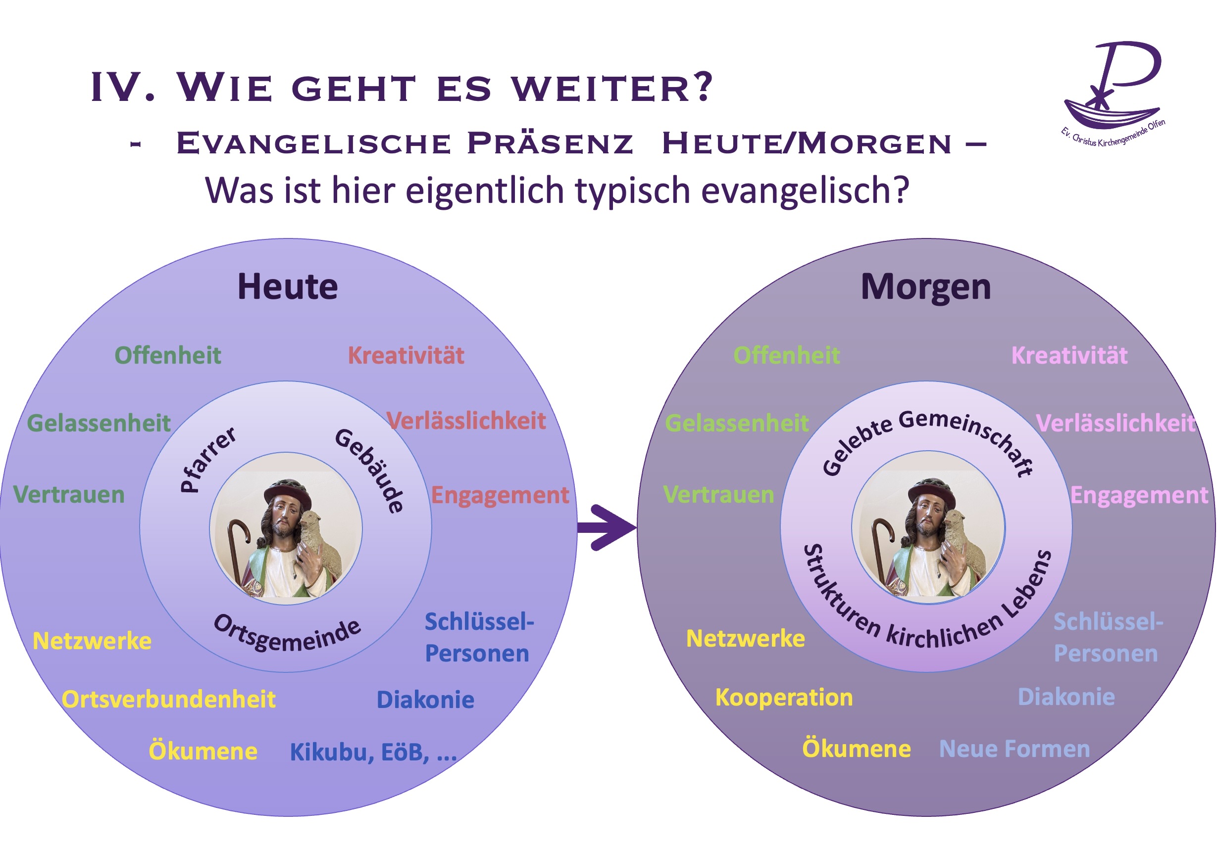 Von dem, was heute sichtbar, greifbar und gewohnt ist, hin zu dem, was morgen vielleicht nicht mehr auf den ersten Blick zu sehen, aber umso spürbarer ist: wie wir glauben, wie wir miteinander leben und uns gegenseitig stärken und tragen, also unsere Gemeinschaft und unsere lebendigen Strukturen, die uns miteinander verbinden.