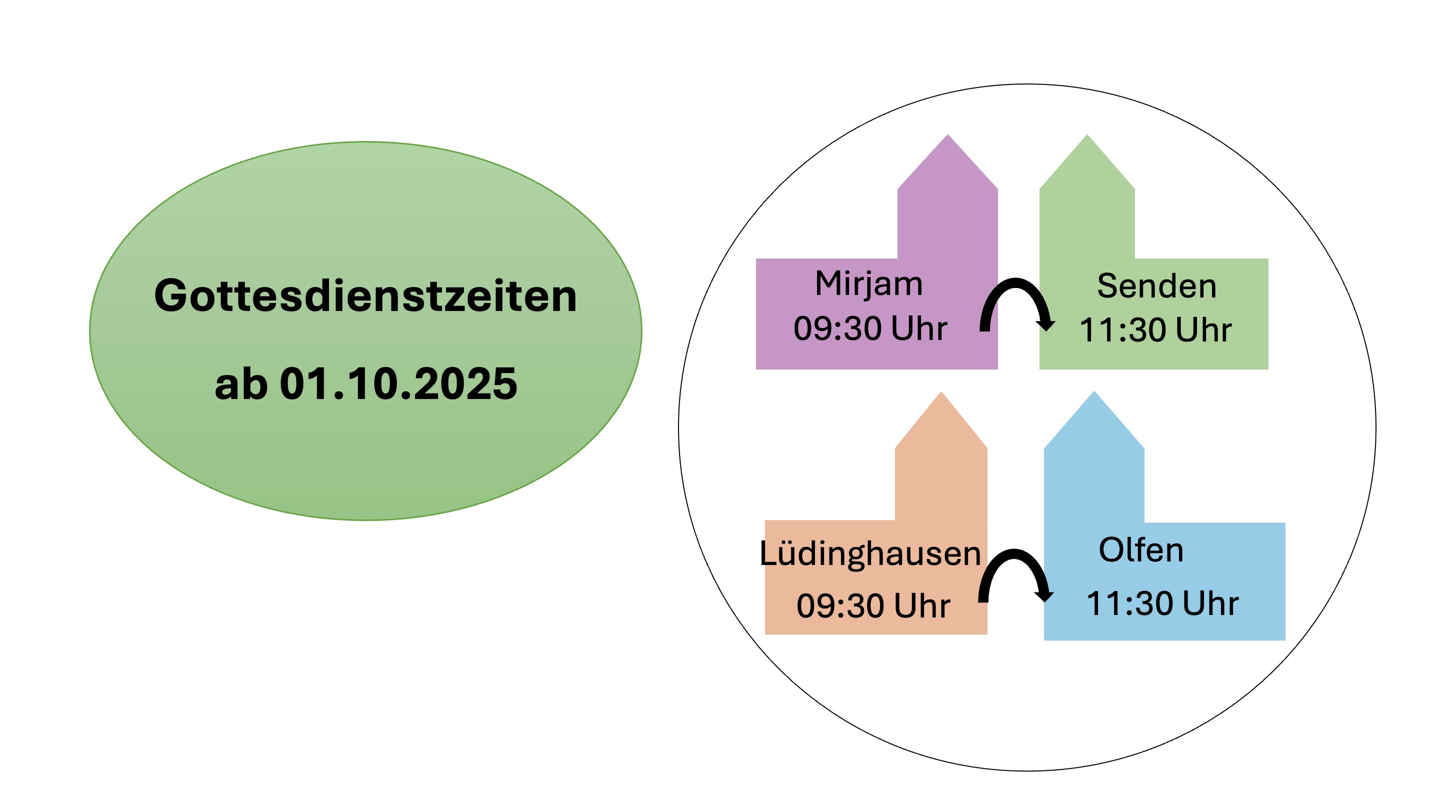 Ein zweites wegweisendes Ergebnis ist eine abgestimmte Gottesdienstlandschaft im Kooperationsraum, die die Feier von Gottesdiensten am Sonntag bei weniger Personal in Zukunft sicherstellt. Auf organisatorischer Ebene bilden die Gemeinden Lüdinghausen und Olfen sowie Senden und Mirjam je ein Gottesdienstpaar. Gottesdienstpaar bedeutet, dass eine hauptamtliche Kraft die Möglichkeit hat, zwei Gottesdienste aufeinanderfolgend zu feiern. Um dies zu ermöglichen, passen die Gemeinden ihre Gottesdienstzeiten zum 01. Oktober 2025 an: Olfen feiert zukünftig um 11:30 Uhr Gottesdienst. Das neue Konzept heißt auch dies: wir feiern mindestens einen Gottesdienst pro Sonntag pro Gemeinde!